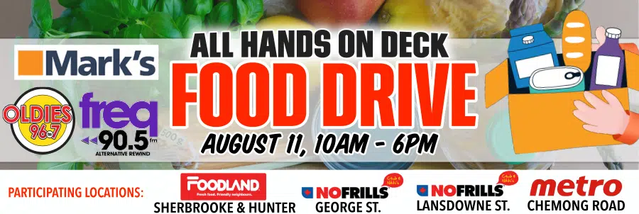 The Mark’s All Hands on Deck Food Drive, which is being held August 11th, has drop off locations around the compass: Metro on Chemong Road, Foodland on Sherbrooke and Hunter, and No Frills locations on George Street and Lansdowne Street.