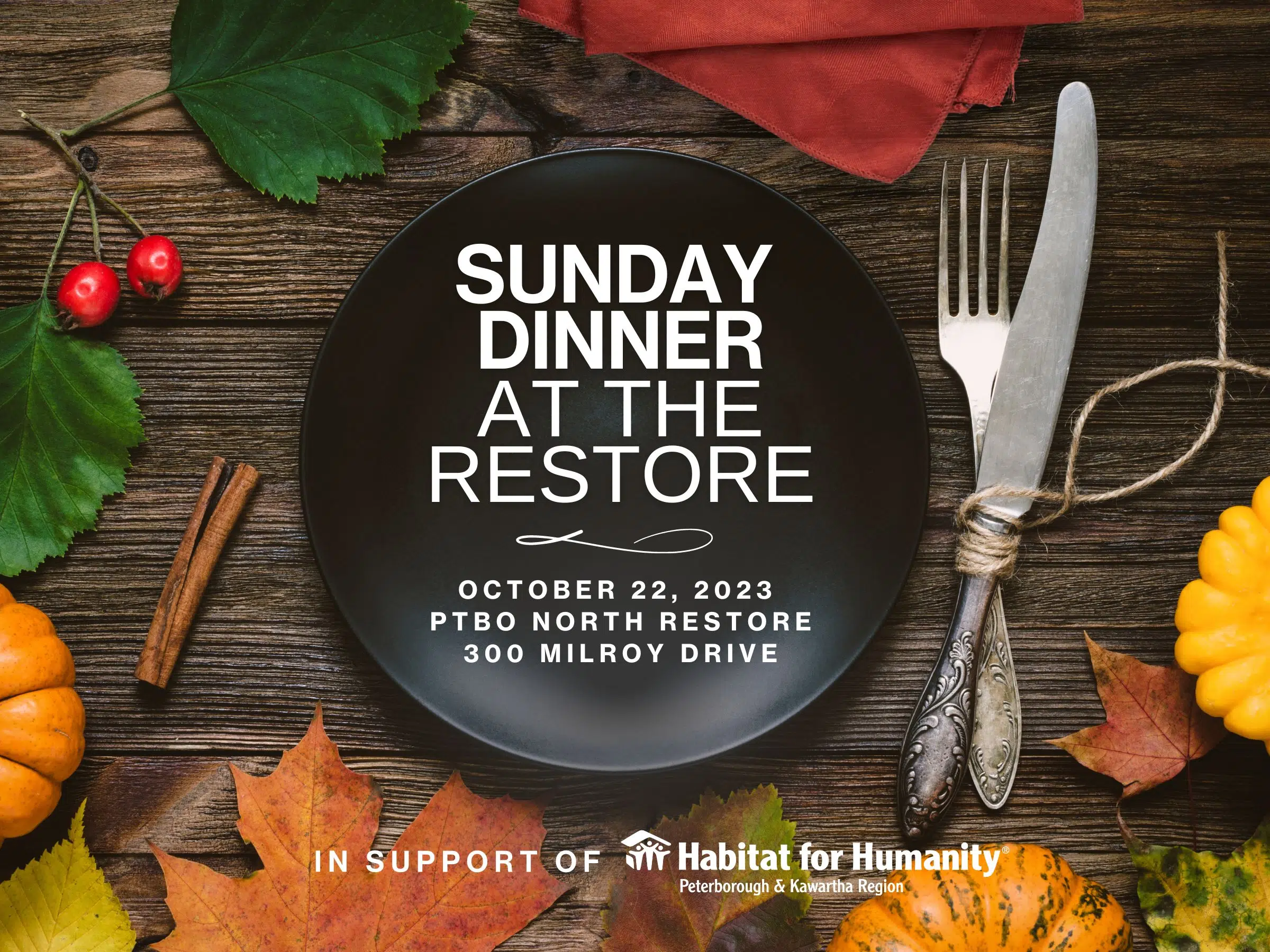 Tickets for Sunday Dinner At The Restore cost $125 with a $65 tax receipt provided. To order, visit www.habitatpkr.ca or phone 705-874-0201.
