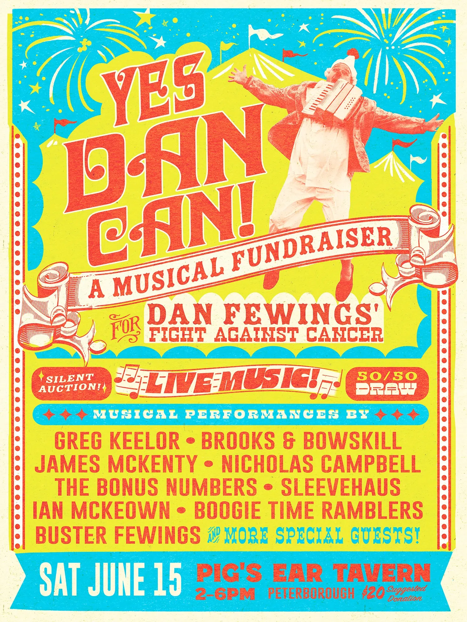 Yes Dan Can, a benefit to help Fewings with costs associated with his treatment, will be held this Saturday (June 15th), 2 to 6 p.m., at the Pig’s Ear Tavern in downtown Peterborough. Among the musical guests confirmed are Greg Keelor, Jimmy Bowskill, James McKenty and Nicholas Campbell.