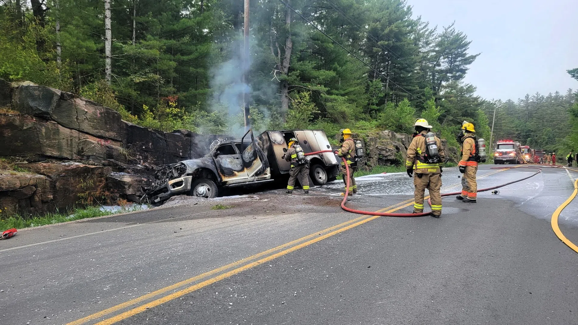 County Road 503 near Kinmount was closed this morning after a commercial vehicle left the roadway and struck a rock-cut, catching fire.