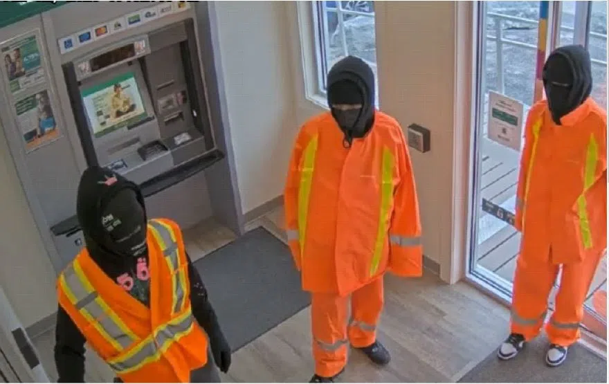 Third suspect: Grey pants; black sweater with pink design and a small crown on the hoodie; construction vest over sweater; black ski mask with white writing on the side; black gloves.
