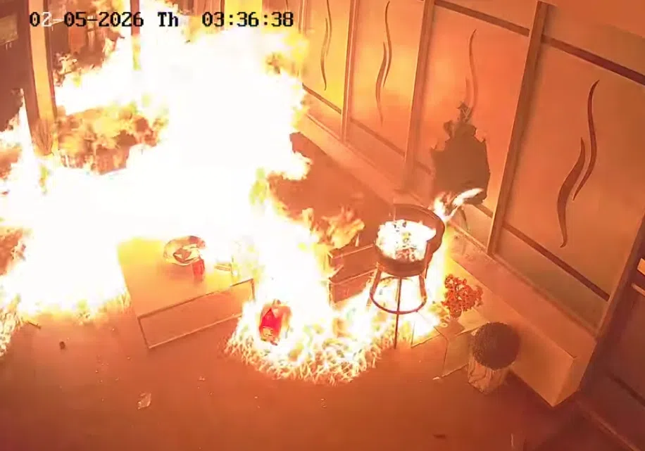 Police have released video footage showing a person breaking the front window of a business before a fire begins.
